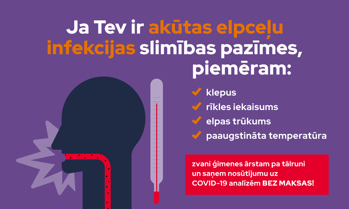Lai ierobežotu COVID-19 izplatību Latvijā, no 22. aprīļa ģimenes ārsts uz valsts apmaksātām COVID-19 analīzēm varēs nosūtīt pacientus, kuriem būs saslimšanas simptomi - paaugstināta ķermeņa temperatūra, klepus, kakla sāpes, apgrūtināta elpošana. Tāpat ģimenes ārsti uz COVID-19 analīzēm varēs nosūtīt visus, kuriem ir pneimonijas jeb plaušu karsoņa klīniskās pazīmes.